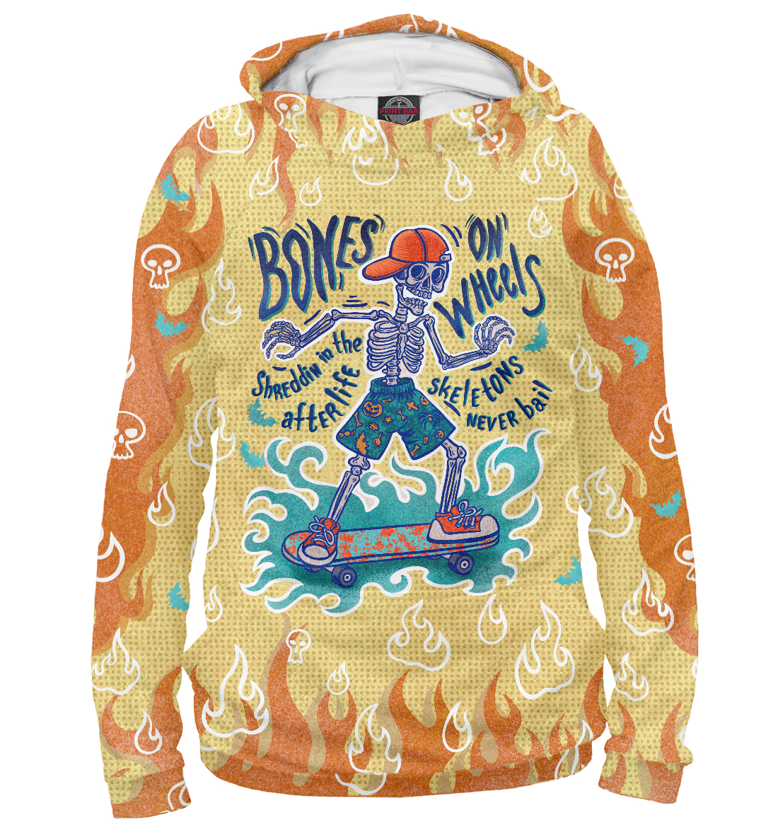Женское худи с принтом «Скелет на скейтборде желтый»