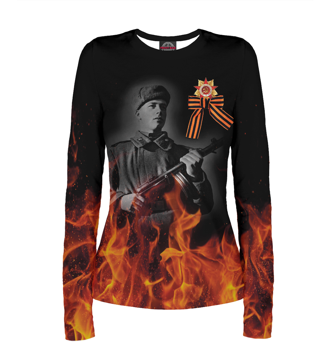 Женский лонгслив с принтом «9 мая Солдат в День Победы»
