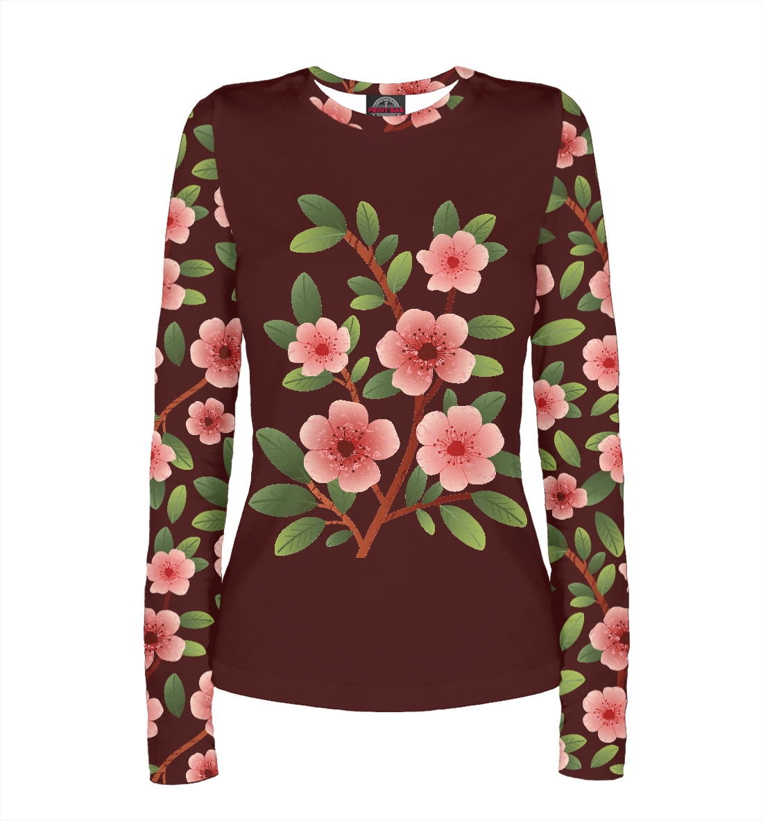 Женский лонгслив с принтом «Цветущая ветка с листьями»