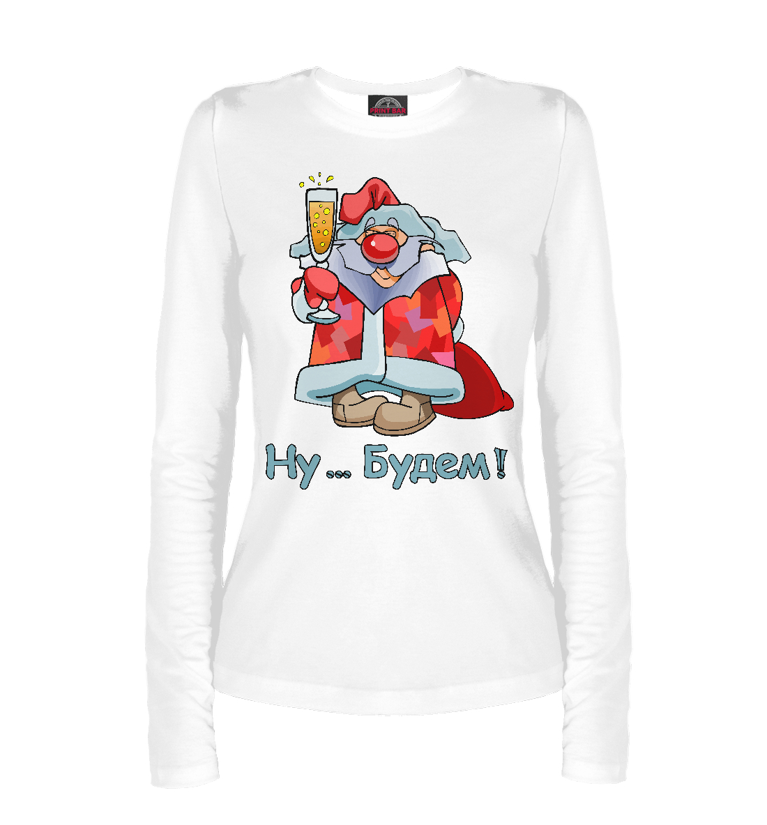 Женский лонгслив с принтом «Дед Мороз с бокалом Ну будем!»