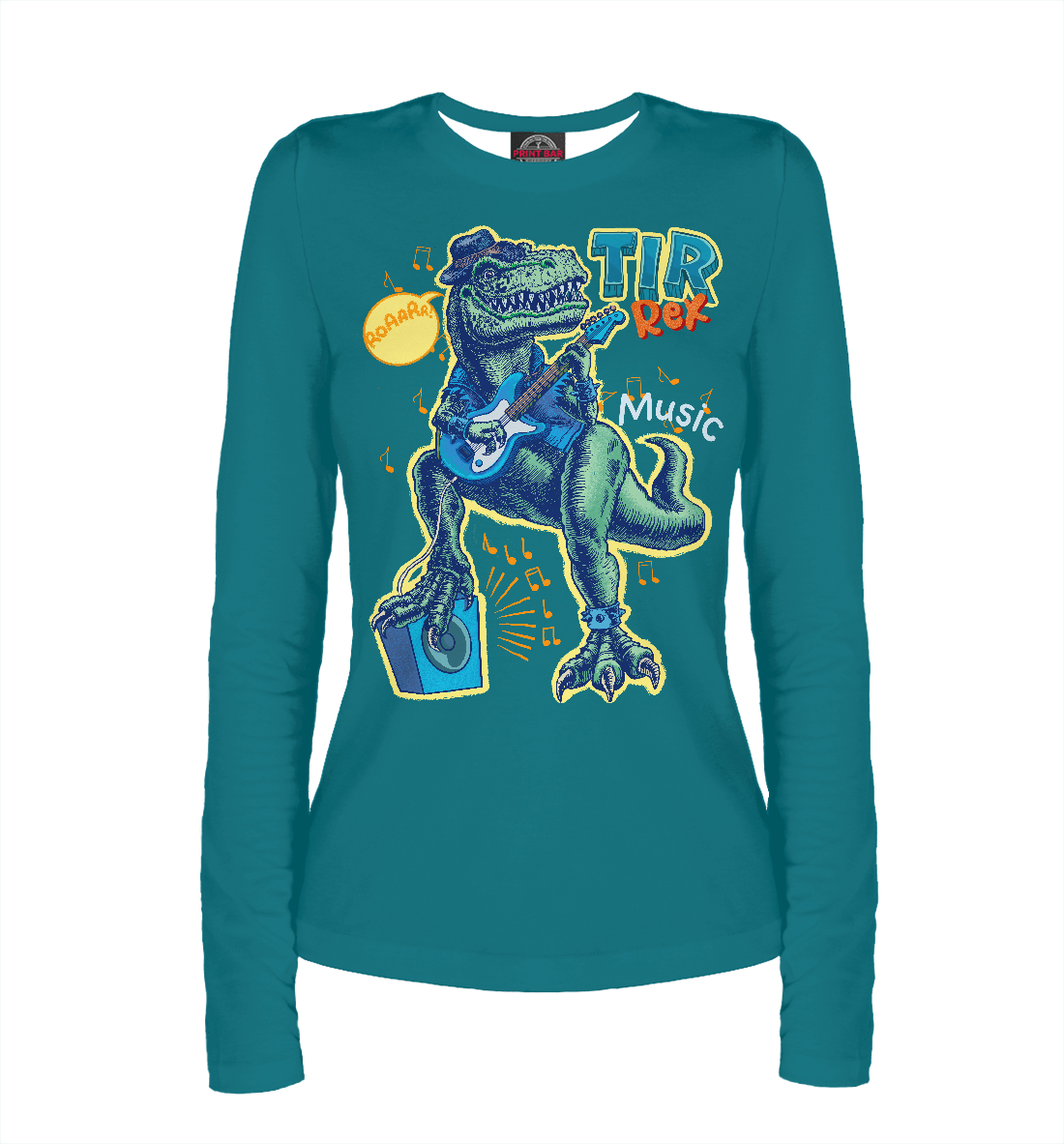 Женский лонгслив с принтом «Динозавр играет на гитаре»