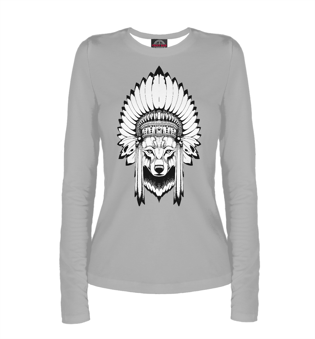 Женский лонгслив с принтом «Индеец волк на сером фоне»