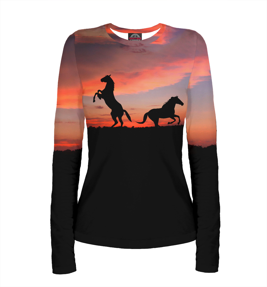Женский лонгслив с принтом «Кони в закате»