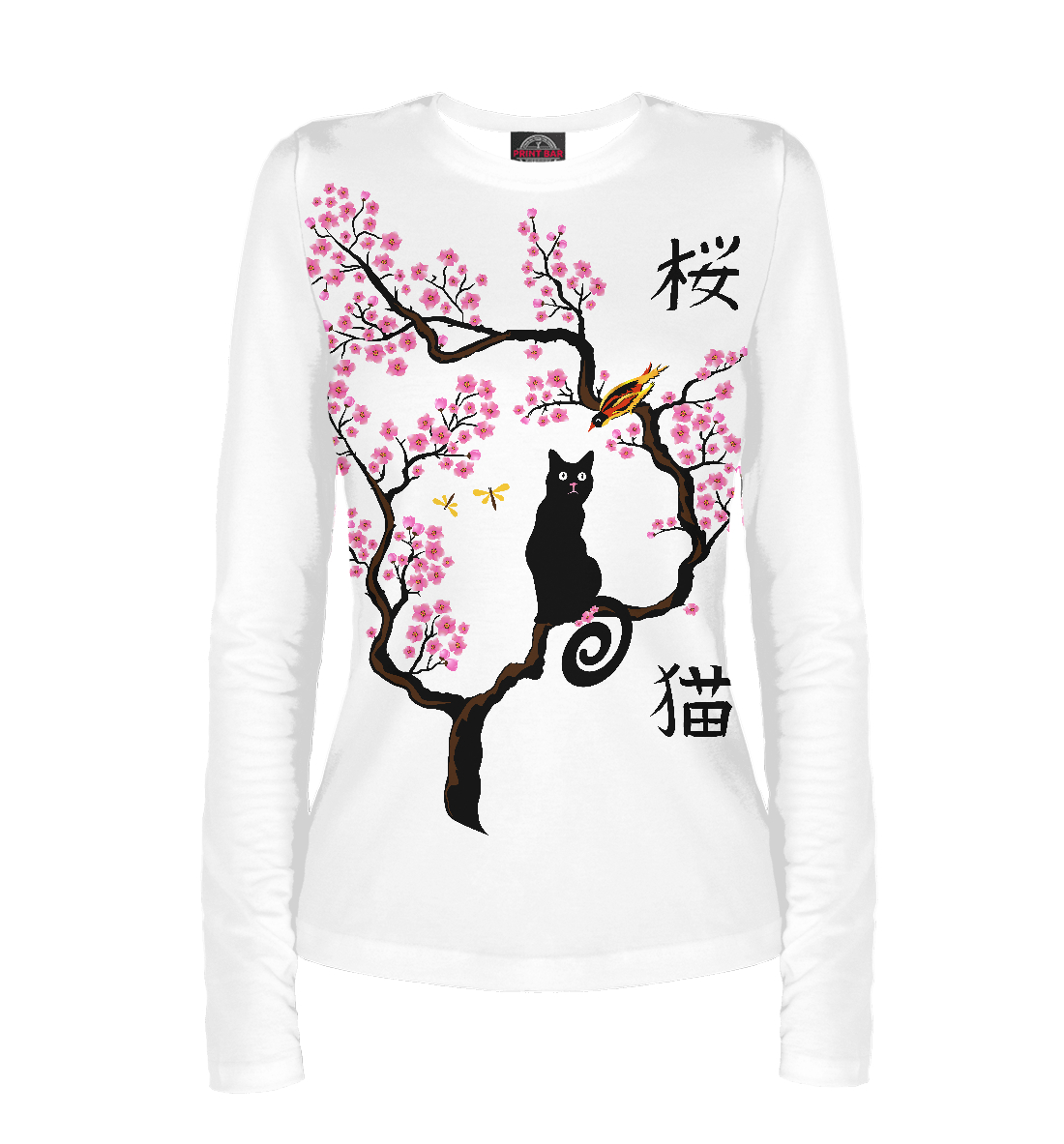 Женский лонгслив с принтом «Кошка и птица на сакуре»