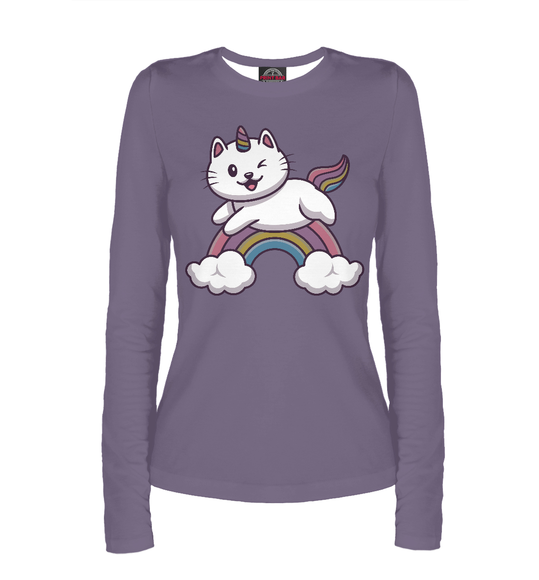 Женский лонгслив с принтом «Кот-единорог на радуше»