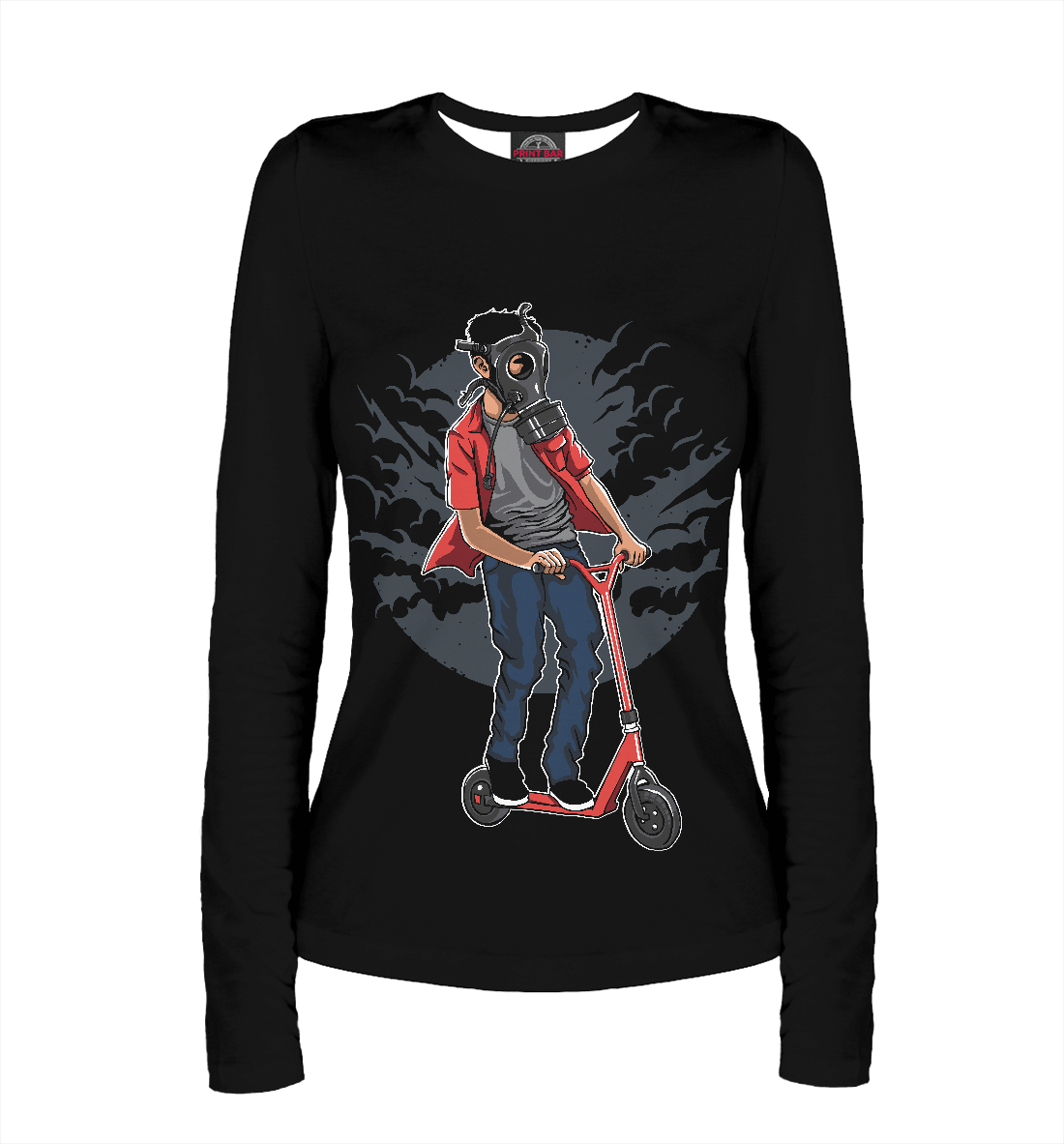 Женский лонгслив с принтом «Мальчик на самокате в противогазе»