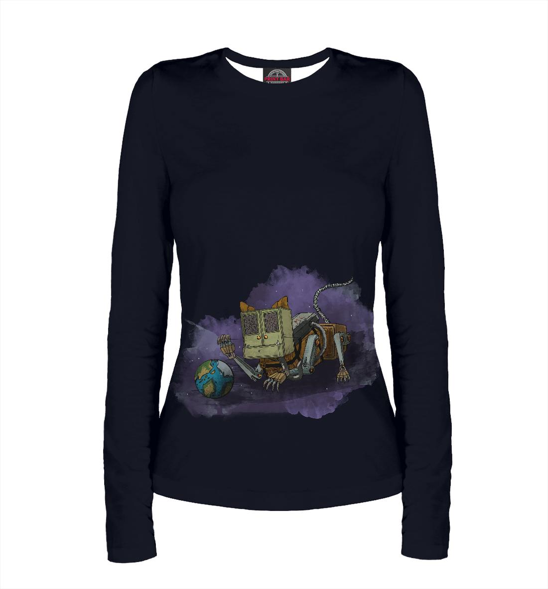 Женский лонгслив с принтом «Механический кот на чёрном фоне»
