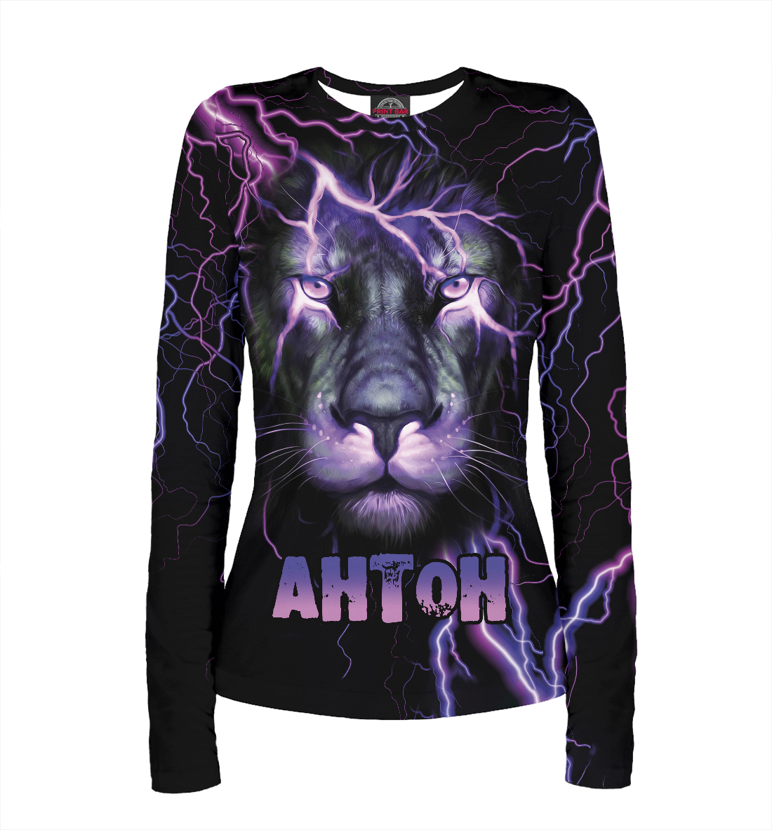 Женский лонгслив с принтом «Неоновый лев Антон»