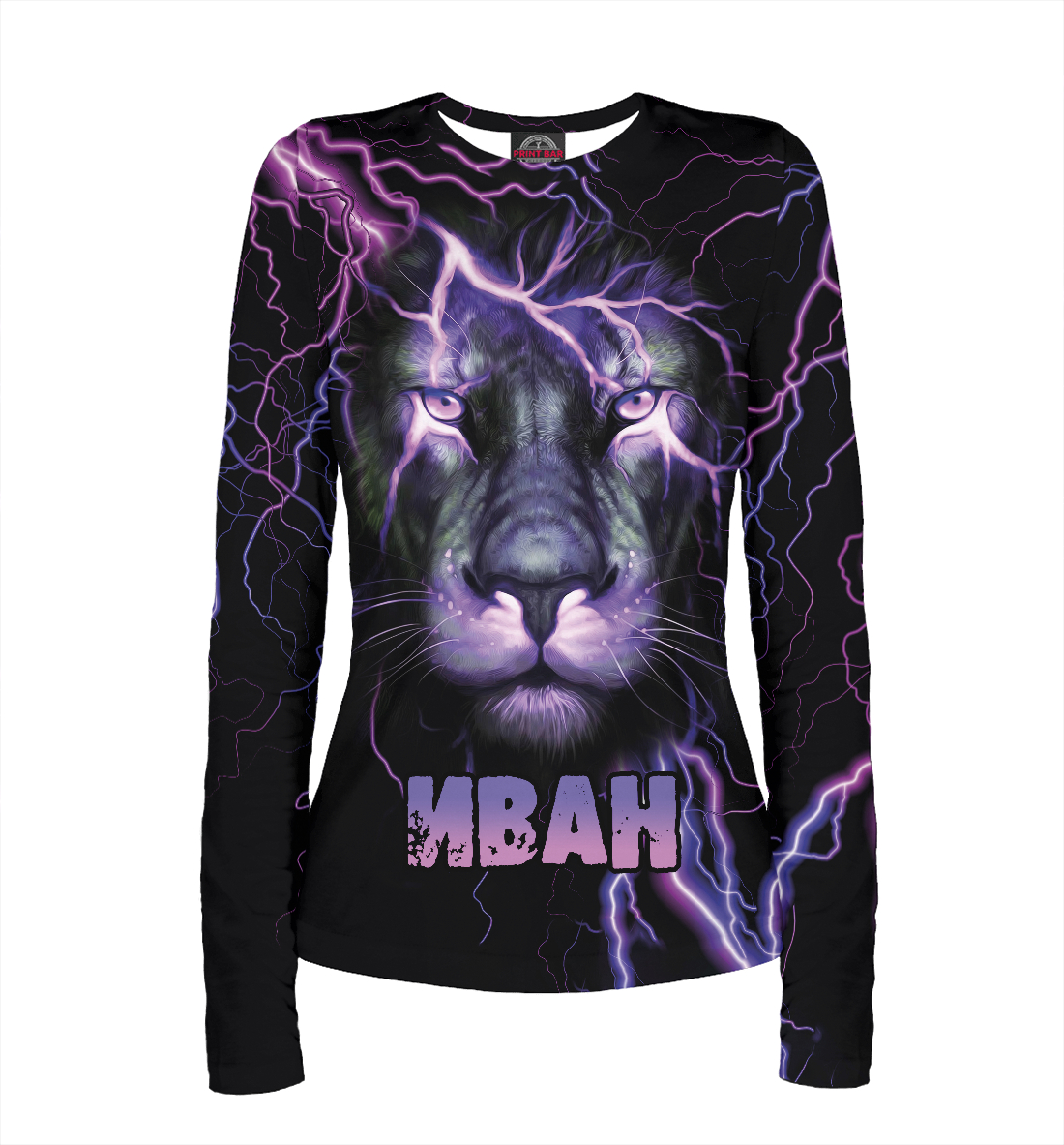Женский лонгслив с принтом «Неоновый лев Иван»
