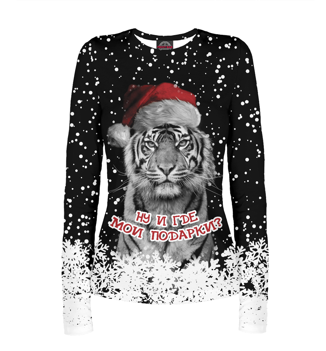 Женский лонгслив с принтом «Ну и где мои подарки?»