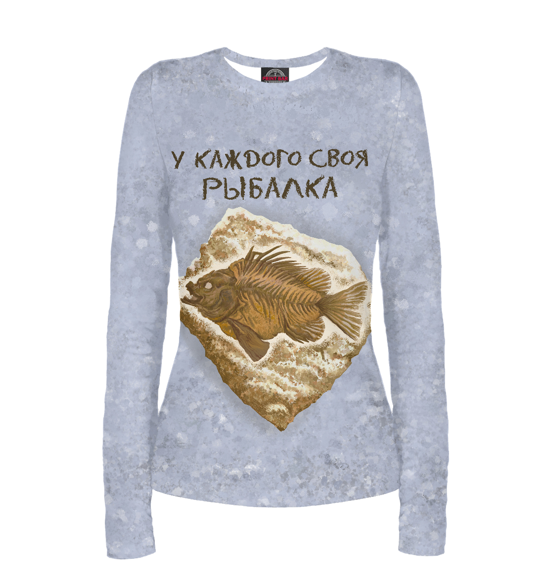 Женский лонгслив с принтом «Окаменелая рыба на камне на сером фоне»