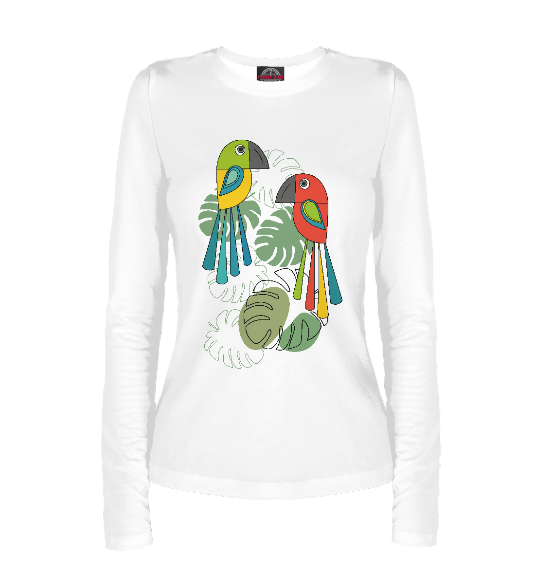 Женский лонгслив с принтом «Попугаи и листья монстеры.»