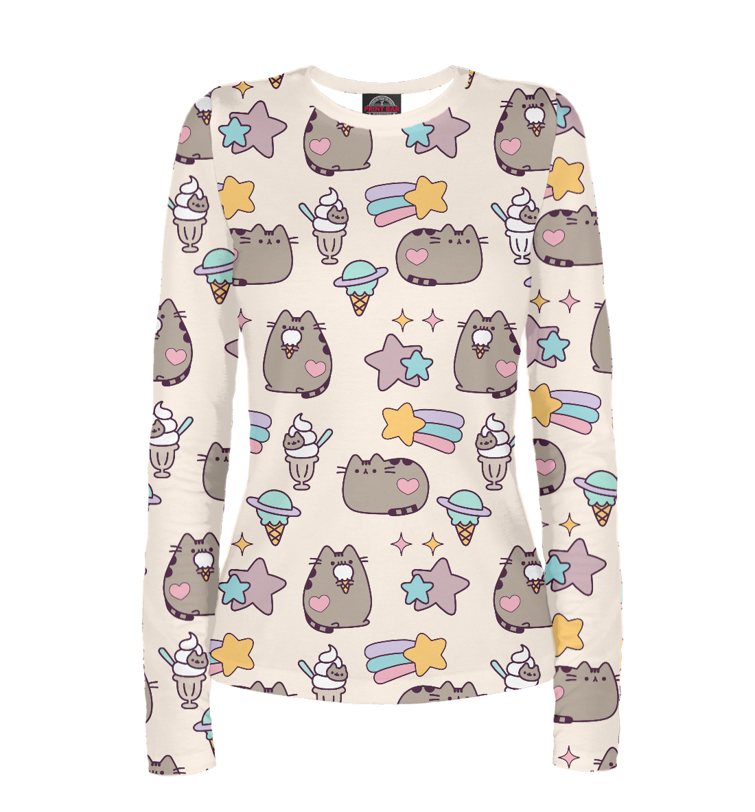 Женский лонгслив с принтом «Pusheen, Звезды и Мороженое»