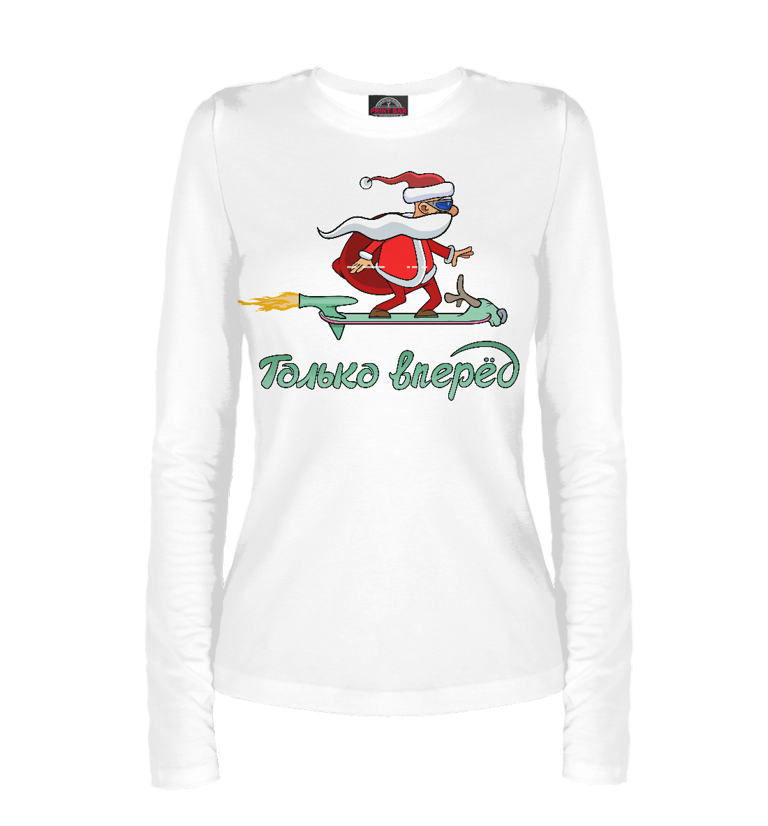 Женский лонгслив с принтом «Санта летит на скейтборде только вперед»
