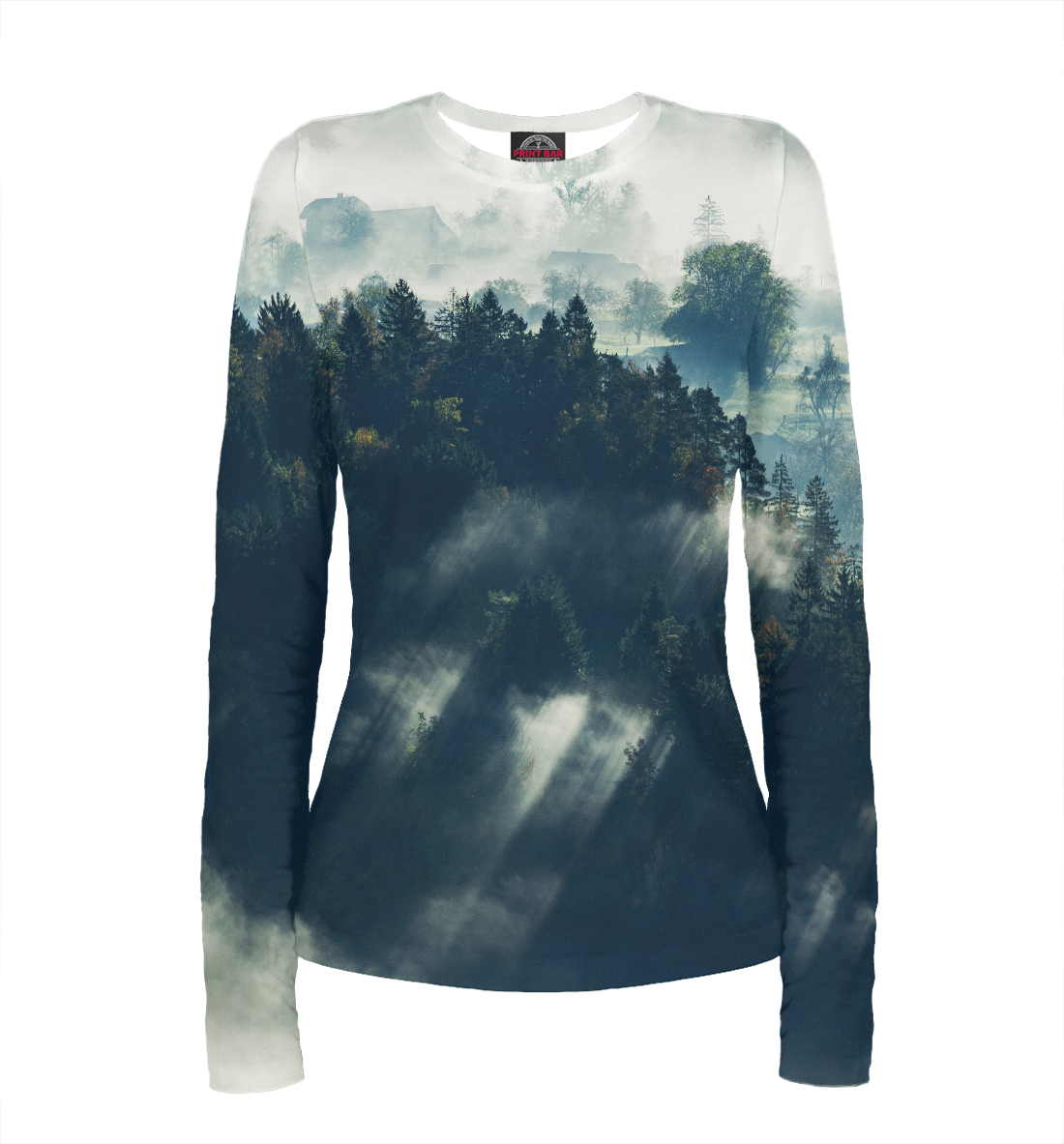 Женский лонгслив с принтом «Туманный лес. Лучи солнца»