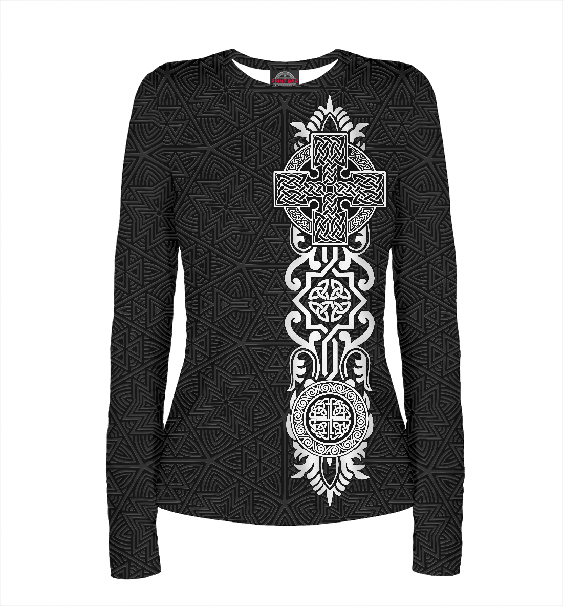 Женский лонгслив с принтом «Вертикальный узор с символикой»