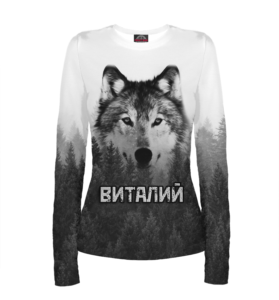Женский лонгслив с принтом «Волк над лесом - Виталий»