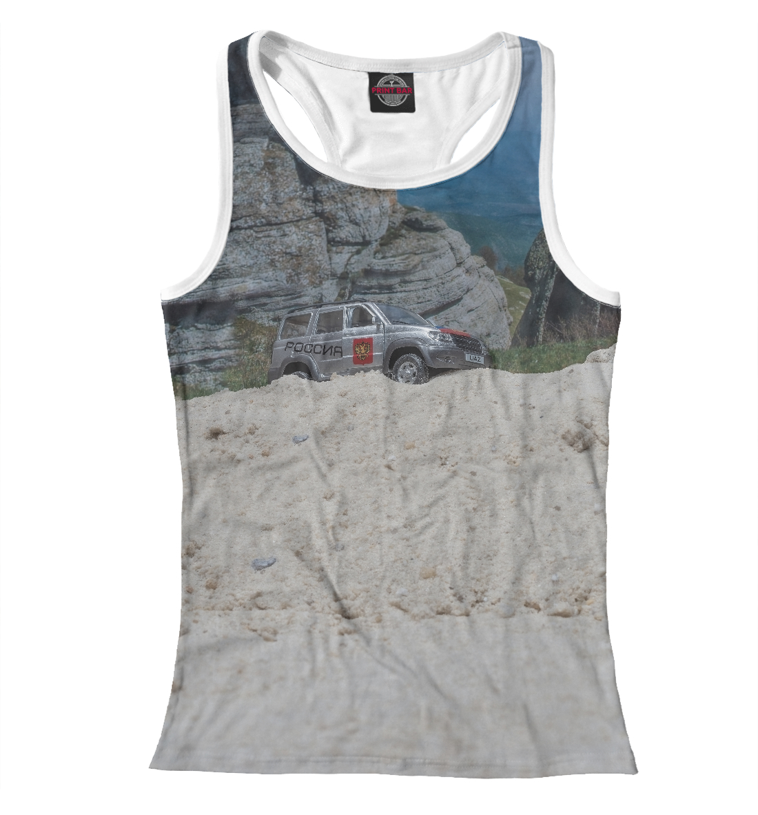 Женская майка-борцовка с принтом «Вездеход УАЗ ПАТРИОТ в горах Крыма»