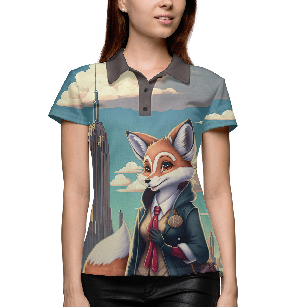 Женское поло с принтом «Лисица в мегаполисе»