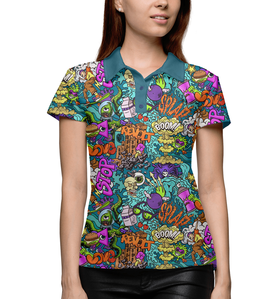 Женское поло с принтом «Стрит арт со скейтером и инопланетянином»