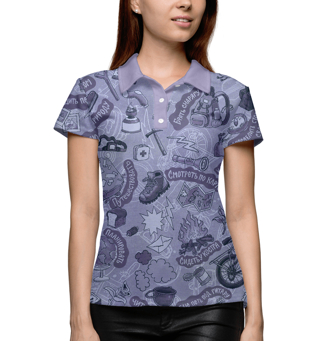 Женское поло с принтом «Туристический набор монохромный»